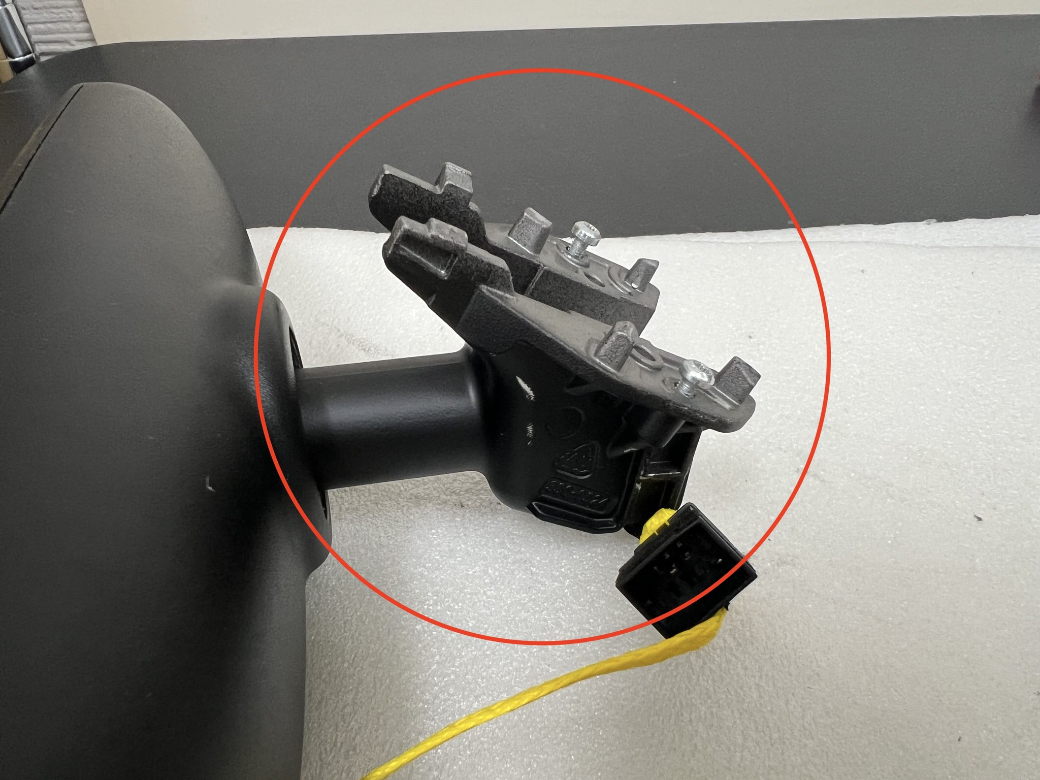 取り付ける純正ミラーブラケットのセンターに配線が通る穴がある場合は穴の中を通して取り付けできますが、配線が通る穴がない場合は赤丸で囲った部分を切り離して配線を逃がしてください。
